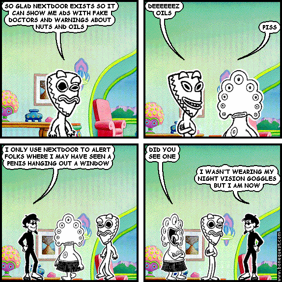 deuce: SO GLAD NEXTDOOR EXISTS SO IT CAN SHOW ME ADS WITH FAKE DOCTORS AND WARNINGS ABOUT NUTS AND OILS deuce: DEEEEEEZ OILS pants: PISS spigot: I ONLY USE NEXTDOOR TO ALERT FOLKS WHERE I MAY HAVE SEEN A PENIS HANGING OUT A WINDOW pants: DID YOU SEE ONE spigot: I WASN'T WEARING MY NIGHT VISION GOGGLES BUT I AM NOW